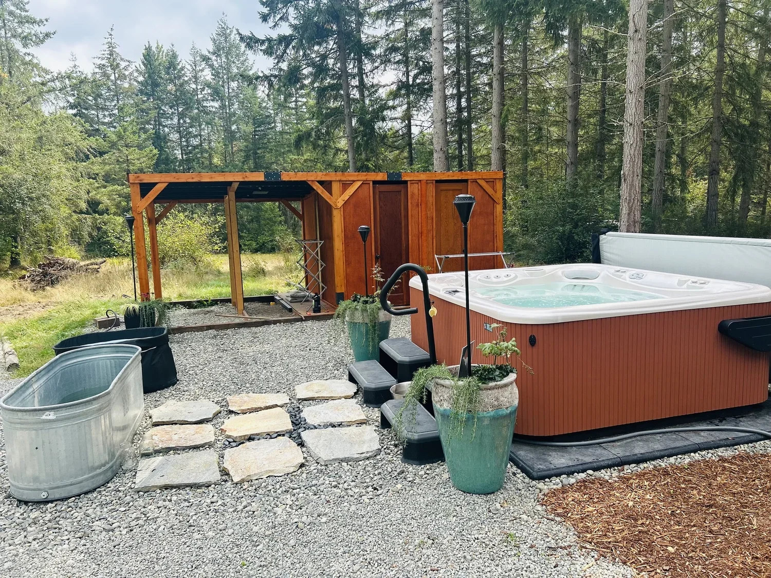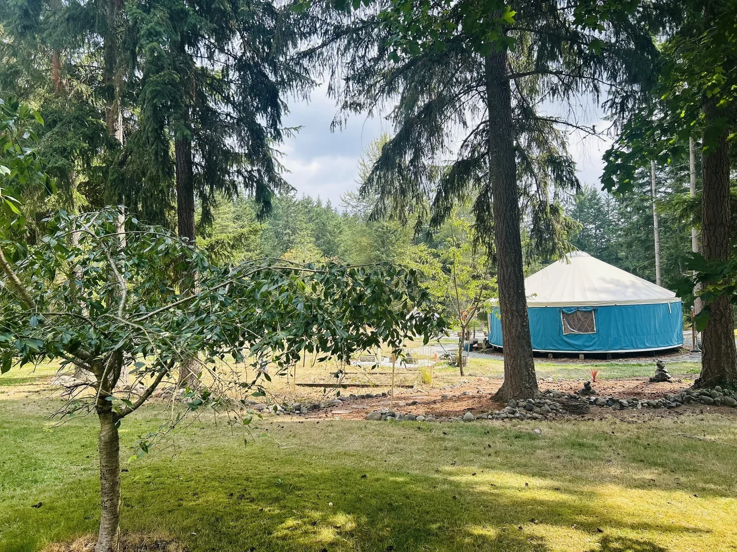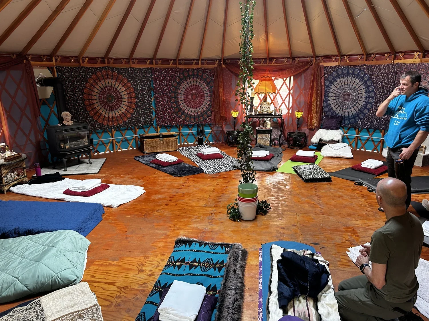 Rest on your comfy journey mat in the shared yurt (provided), book one of three bell tents or reserve and indoor bedroom. Enjoy the sauna, cold plunge and hot tub post-ceremony.
